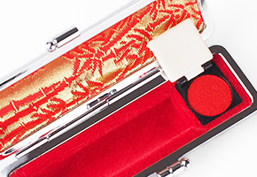 | 天然のオーストリッチを使用した高級印鑑ケース。 | 内張りには縁起物の朱竹柄が刺繍されています。 |