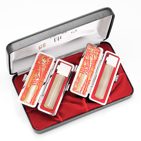 個人印鑑2本[手彫り仕上げ]・オランダ水牛純白(アタリ有無選択可能)・エンボスオーストリッチケースコンパクトセット+エクセレントセットケース