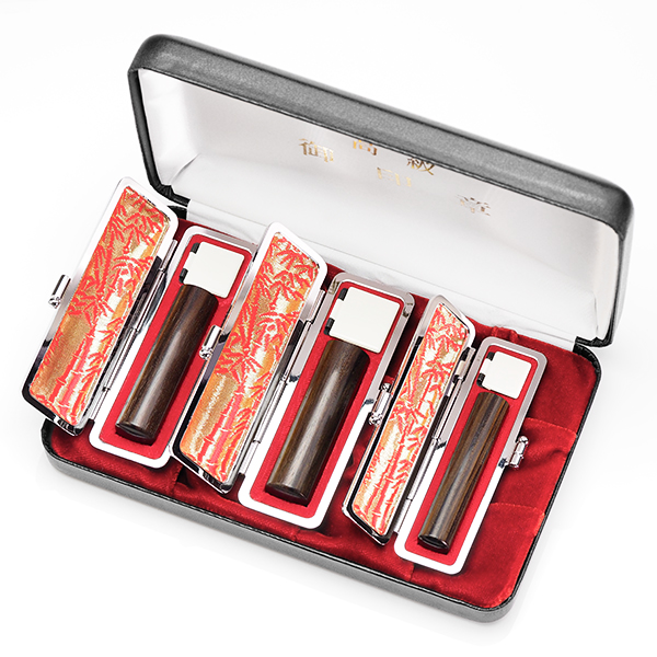 個人印鑑3本[手彫り仕上げ]・黒檀(アタリ有無選択可能)・エンボスオーストリッチケースラグジュアリーセット+エクセレントセットケース