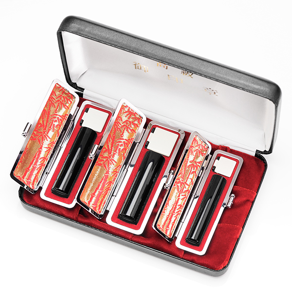 銀行印(16.5mm)×1 認印(13.5mm)×1 エンボスオーストリッチケース(3色から選択可能)・16.5〜18mm用×2 エンボスオーストリッチケース(3色から選択可能)・13.5〜15mm用×1 エクセレントセットケース(3色から選択可能)・3本収納用×1