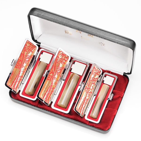 銀行印(16.5mm)×1 認印(13.5mm)×1 エンボスオーストリッチケース(3色から選択可能)・16.5〜18mm用×2 エンボスオーストリッチケース(3色から選択可能)・13.5〜15mm用×1 エクセレントセットケース(3色から選択可能)・3本収納用×1