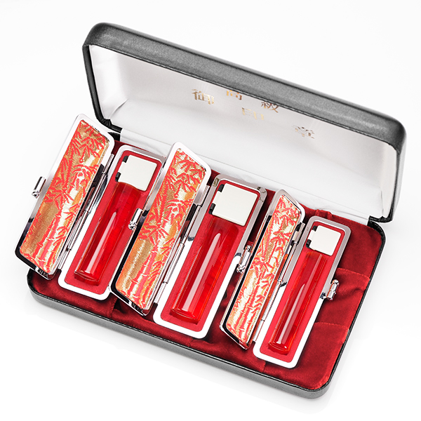 銀行印(16.5mm)×1 認印(13.5mm)×1 もみ革ケース(6色から選択可能)・16.5〜18mm用×2 もみ革ケース(6色から選択可能)・13.5〜15mm用×1 エクセレントセットケース(3色から選択可能)・3本収納用×1