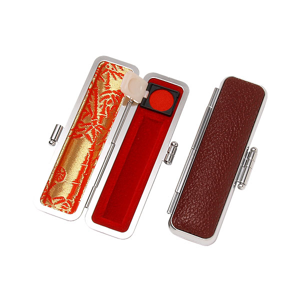 ご印鑑ケース[丸寸胴用]・もみ革ケース(外装マルーン・内張:朱竹)・印鑑長さ約60mm・直径10.5mm〜12mm用・簡易朱肉付き