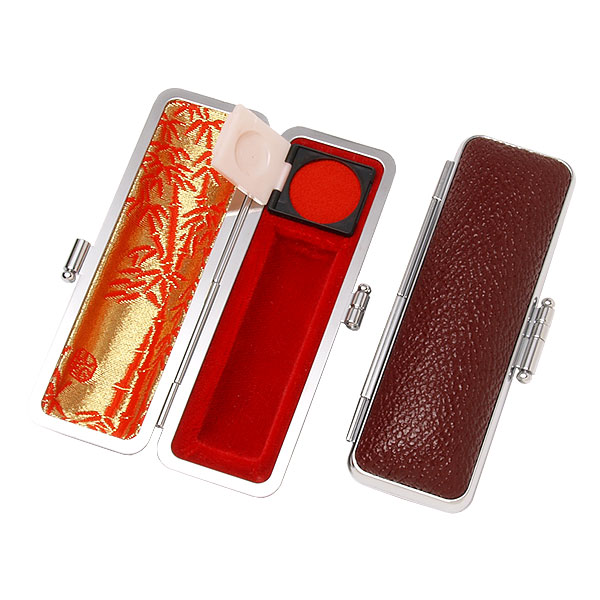 ご印鑑ケース[丸寸胴用]・もみ革ケース(外装マルーン・内張:朱竹)・印鑑長さ約60mm・直径16.5mm〜18mm用・簡易朱肉付き