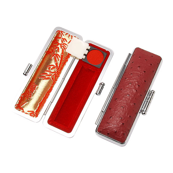 ご印鑑ケース[丸寸胴用]・エンボスオーストリッチケース(カンパリ)・印鑑長さ約60mm・直径13.5mm〜15mm用・簡易朱肉付き