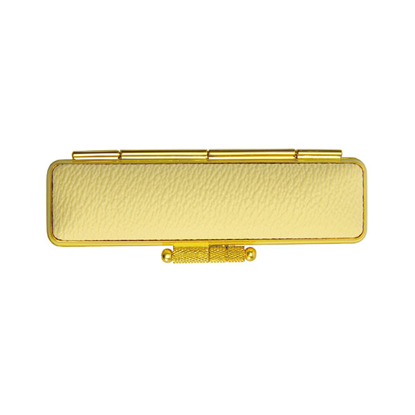 本革で出すことが出来ない淡いメルヘン調の色彩、純金メッキに同色の樹脂ラインのフレームを使っています。