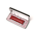 光沢のある塗装を施した、印鑑ケースを収納する金属製ボディのケース。 |