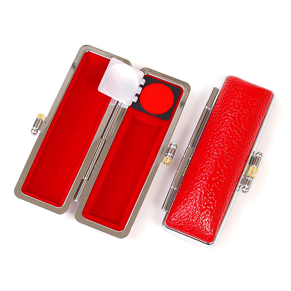 ご印鑑ケース[丸寸胴用]・ネオクロームケース・牛もみ革(外装レッド・内張レッド)印鑑長さ約60mm・印面直径16.5mm〜18mm用・簡易朱肉付き