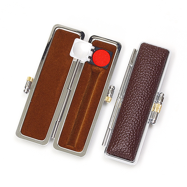 ご印鑑ケース[丸寸胴用・訂正印]・ネオクローム訂正印ケース・牛もみ革(外装ブラウン・内張ブラウン)印鑑長さ約60mm・印面直径6mm用・簡易朱肉付き
