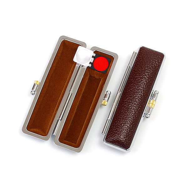 ご印鑑ケース[丸寸胴用]・ネオクロームケース・牛もみ革(外装ブラウン・内張ブラウン)印鑑長さ約60mm・印面直径10.5mm〜12mm用・簡易朱肉付き