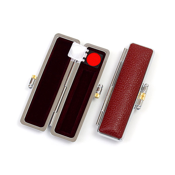 ご印鑑ケース[丸寸胴用]・ネオクロームケース・牛もみ革(外装マルーン・内張マルーン)印鑑長さ約60mm・印面直径10.5mm〜12mm用・簡易朱肉付き
