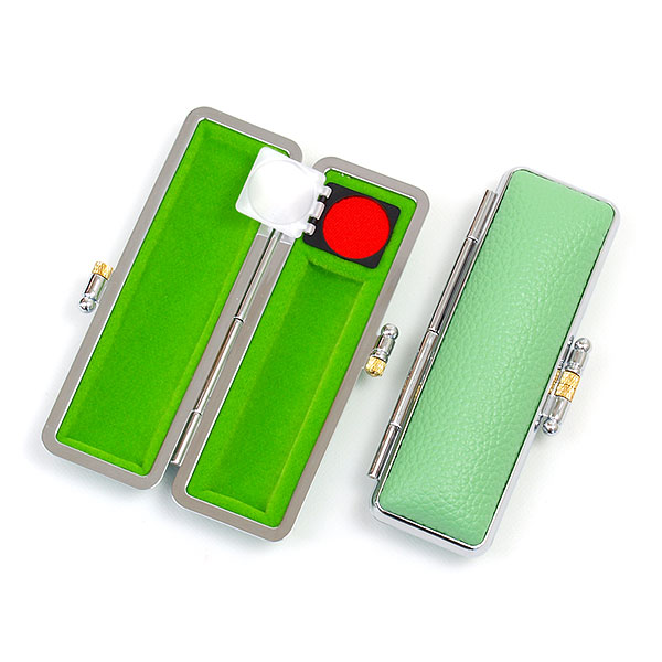 ご印鑑ケース[丸寸胴用]・ネオクロームケース・牛もみ革(外装ライトグリーン・内張ライム)印鑑長さ約60mm・印面直径13.5mm〜15mm用・簡易朱肉付き