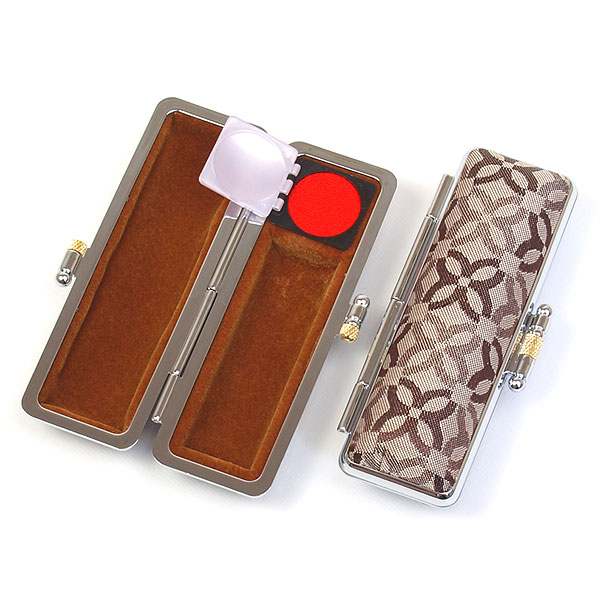 ご印鑑ケース[丸寸胴用]・モノグラム(ショコラ)印鑑長さ約60mm・印面直径16.5mm〜18mm用・簡易朱肉付き