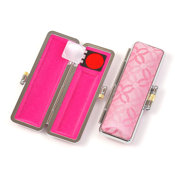 ご印鑑ケース[丸寸胴用]・モノグラム(パステルピンク)印鑑長さ約60mm・印面直径13.5mm〜15mm用・簡易朱肉付き