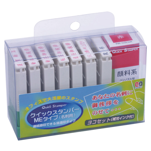 サンビー・クイックスタンパー(既製品) MEタイプ・名刺用ご挨拶印 ヨコセット(10cc補充インク赤×1 付き)[SANBY・QUICK STAMPER・QMEY-100]