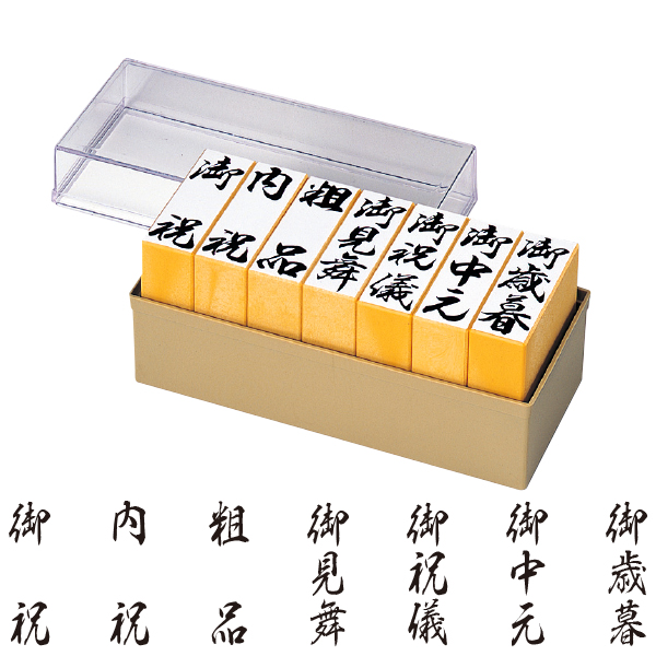「御祝」、「御見舞」、「御祝儀」、「御歳暮」など、のし袋への捺印に便利な贈答用ゴム印の7本組みセットです。