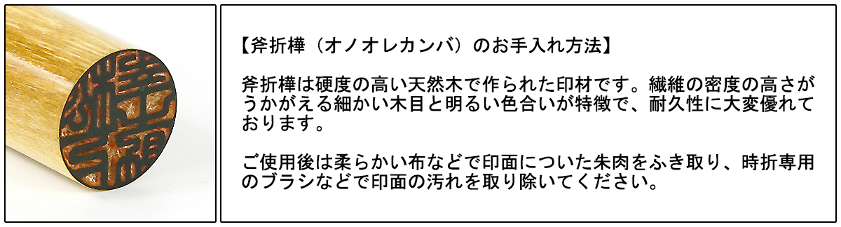 名前の通りとても硬い材質で、繊維分が大変緻密で捺印性も良く、印鑑に適しております。また、オノオレカンバは別名「金のなる木」と呼ばれ、縁起の良い木として珍重されています。